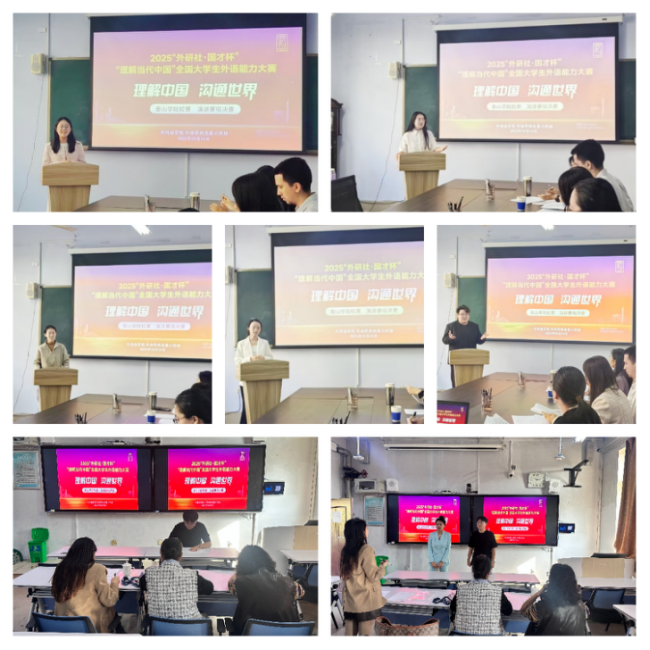 比赛环节中,英语组演讲赛场气氛热烈,全校8名优秀学子紧扣 “Strike the Waves(击水中流,破浪前行)”的大赛主题,在定题演讲与现场提问环节从容应答,尽显青春风采与扎实的外语素养;口译赛场则展现专业实力,3名参赛学子思维敏捷、表达流畅,展现出扎实的语言功底与出色的临场应变能力。评委团全程从内容逻辑、语言表达、临场反应等维度,对选手表现进行综合评定,确保评审公平专业。